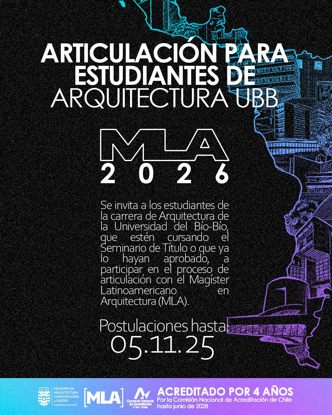 Se invita a las y los estudiantes de la carrera de Arquitectura de la Universidad del Bío-Bío, que se encuentren cursando el Seminario de Título o que ya lo hayan aprobado, a participar en el proceso de articulación con el Magíster Latinoamericano en Arquitectura (MLA).