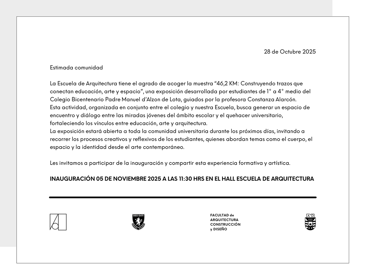 La Escuela de Arquitectura de la Universidad del Bío-Bío tiene el agrado de acoger la muestra “46,2 KM: Construyendo trazos que conectan educación, arte y espacio”, una exposición creada por estudiantes del Colegio Bicentenario Padre Manuel d’Alzon de Lota, bajo la guía de la profesora Constanza Alarcón.
