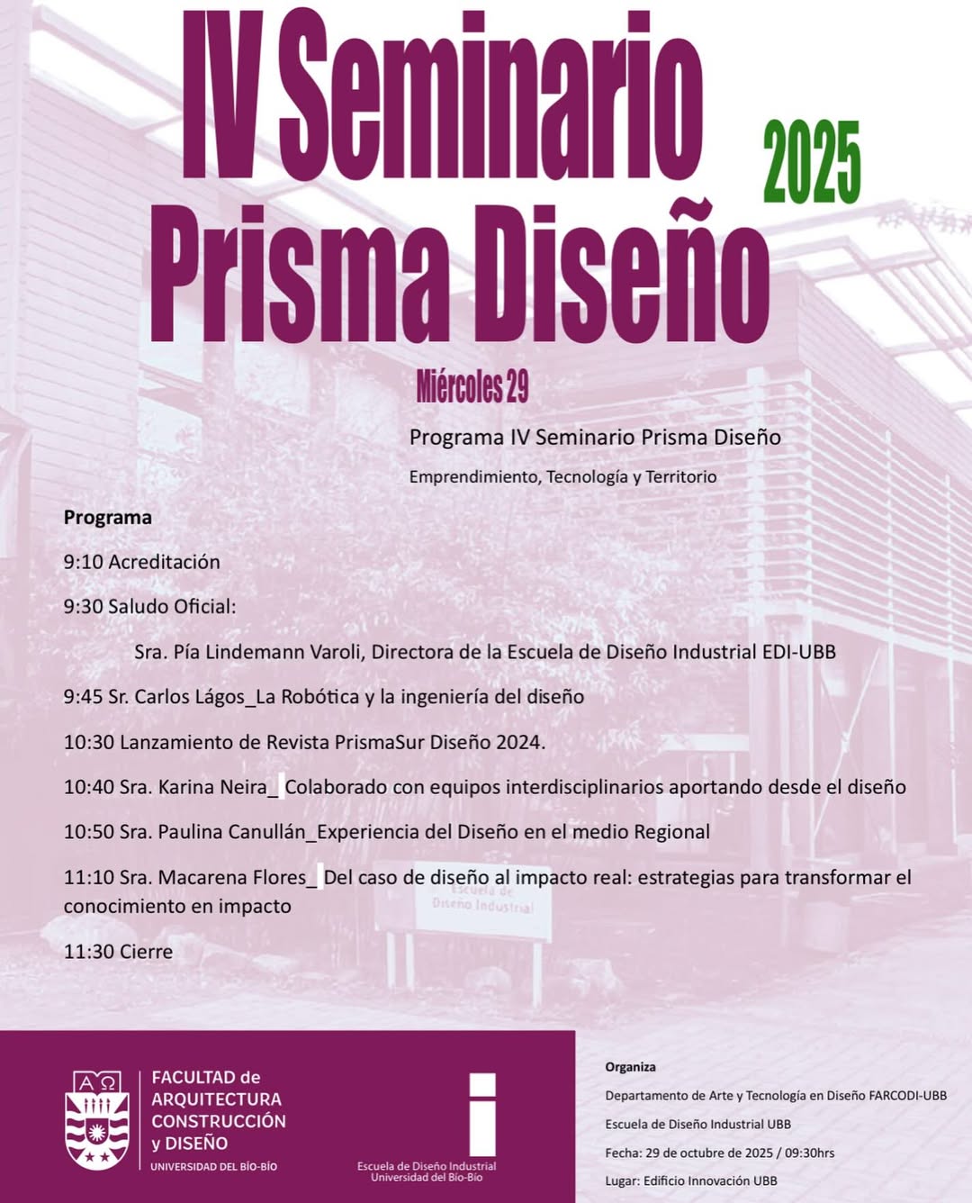 El IV Seminario Prisma Diseño 2025 es organizado por el Departamento de Arte y Tecnología en Diseño (FARCODI-UBB) y la Escuela de Diseño Industrial, consolidándose como un espacio de encuentro académico y profesional que promueve la reflexión sobre los desafíos del diseño en contextos tecnológicos y territoriales.