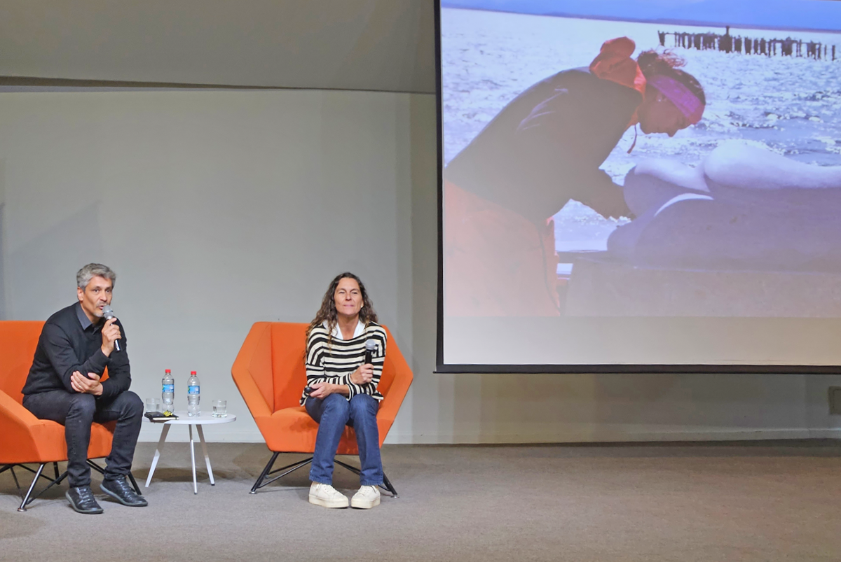“Esculturas en espacios públicos” fue el tema del conversatorio con la comunidad, en el que Marcela Romagnoli estuvo acompañada del director de Extensión de la UBB, Hernán Barría. En la ocasión, la escultora aseveró que desde sus inicios anhelaba el espacio público y urbano, donde es posible que la escultura quede accesible a todas las personas con la posibilidad de tocar y conocer sus materialidades.