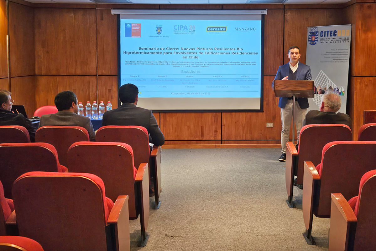El miércoles 9 de abril, en el auditorio del Centro de Investigación en Tecnologías de la Construcción (CITEC) de la Universidad del Bío-Bío, se llevó a cabo el seminario de cierre del proyecto Fondef ID22I10224, titulado “Nuevas Pinturas Resilientes Bio Higrotérmicamente para Envolventes de Edificaciones Residenciales en Chile”. En la instancia se presentó los resultados del proyecto Fondef ID22I10224: Nuevas tecnologías para pinturas de terminación interior y elementos envolventes de construcciones habitacionales, resilientes bio higrotérmicamente, que incorporan nanotecnología y conceptos de química verde para mitigar efectos del cambio climático. Participan de la iniciativa el Centro de Investigación de Polímeros Avanzados, CIPA; el Centro de Investigación en Tecnología de la Construcción de la Universidad del Bío-Bío, (CITEC UBB); Industrias Ceresita S.A y Constructora Manzano y Asociados Ltda.