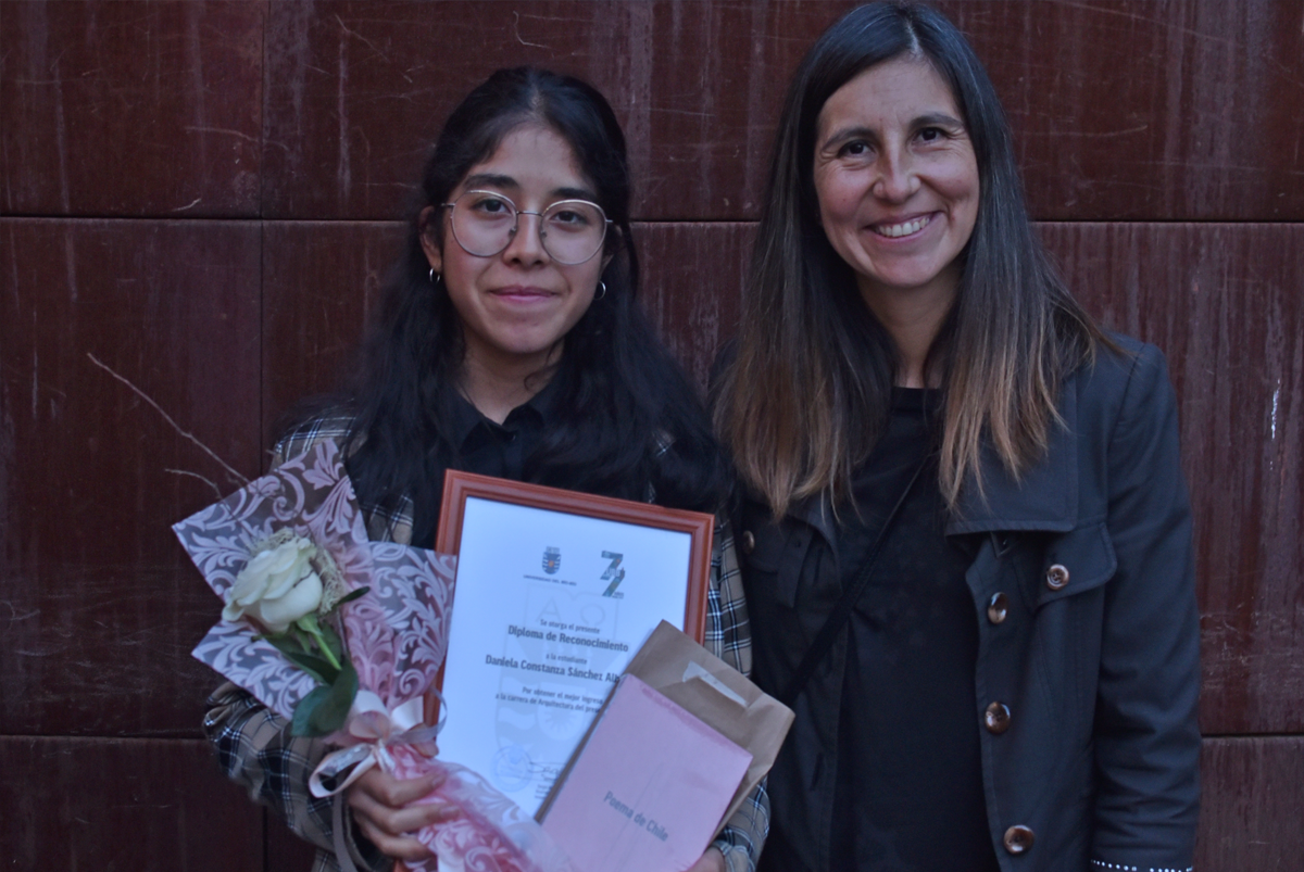 Daniela Sánchez Albornoz, estudiante de Arquitectura y reconocida como mejor puntaje de su carrera, junto a nuestra Secretaria Académica Dra. Jessica Fuentealba Quilodrán. Fotografía de Manuel Morales Requena, integrante de la Unidad de Comunicaciones de la Farcodi UBB. Al respecto Daniela Sánchez expresó su alegría por ingresar a la carrera, esperando aprender y desarrollar su creatividad.