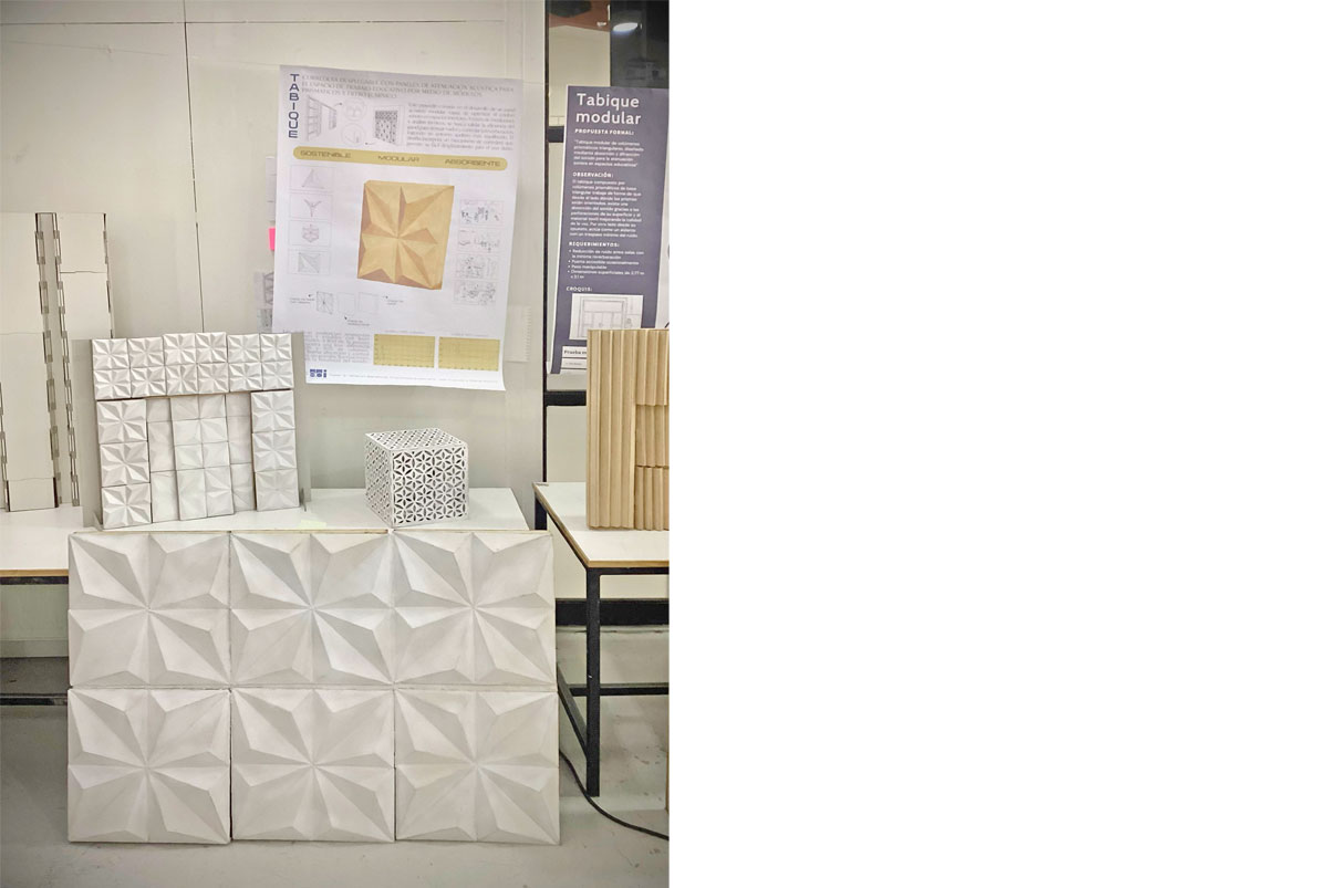 Simultáneamente, la experiencia ha sido incorporada al Taller de Diseño 3, donde estudiantes desarrollan ejercicios de prototipado utilizando textiles reciclados y materiales de bajo impacto ambiental. Uno de los focos principales ha sido la investigación en soluciones fonoabsorbentes para mejorar la calidad acústica en espacios interiores, con un enfoque material experimental y proyectual.