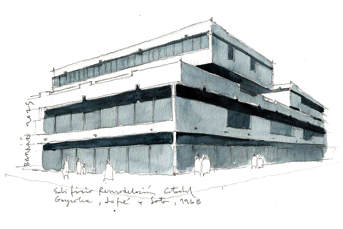 Edificio Remodelación Catedral Goycolea, Jofré y Soto, 1968. Dibujo y acuarela de Hernán Barría Chateau.