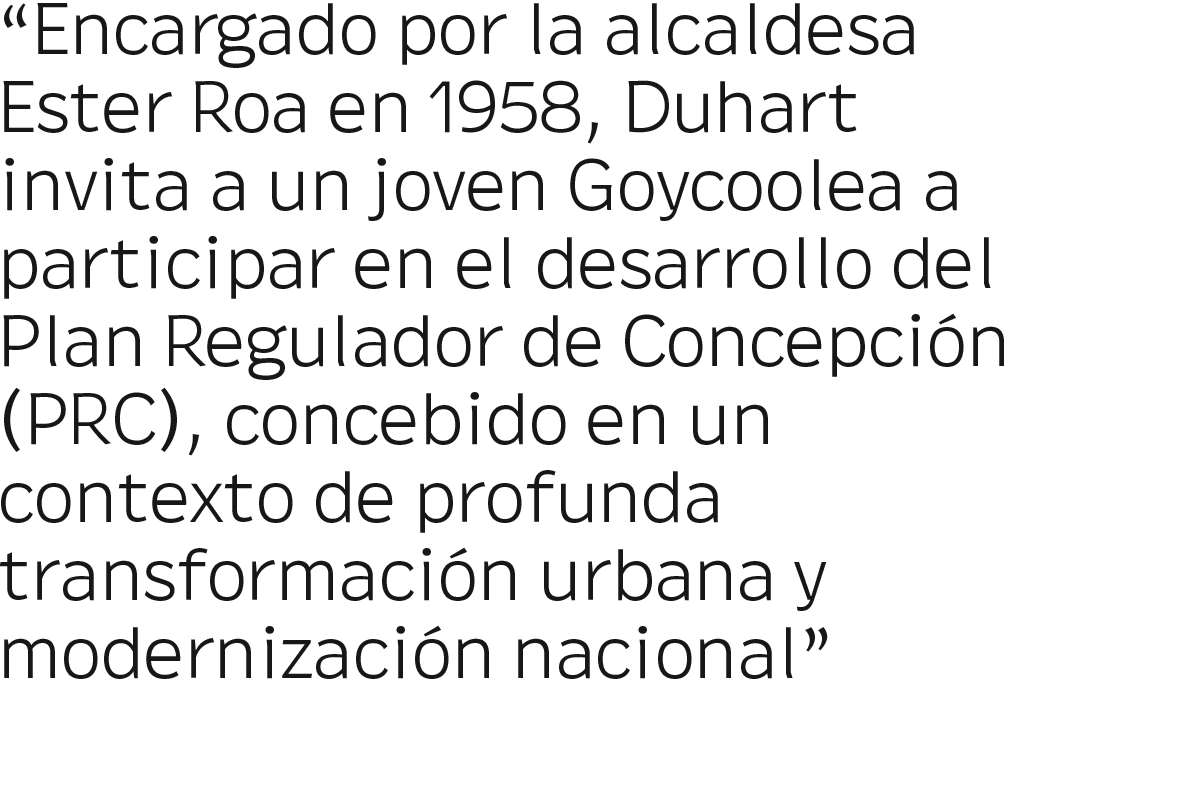 Encargado por la alcaldesa Ester Roa en 1958, Duhart invita a un joven Goycoolea a participar en el desarrollo del Plan Regulador de Concepción (PRC), concebido en un contexto de profunda transformación urbana y modernización nacional. Esta colaboración consolidó un trabajo compartido que más tarde se vería reflejado en el diseño de obras como la Biblioteca de la Universidad de Concepción y los colegios Charles de Gaulle e Inmaculada Concepción.