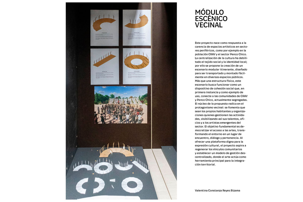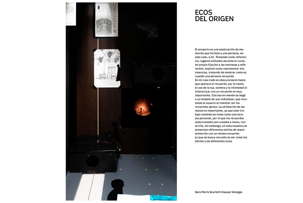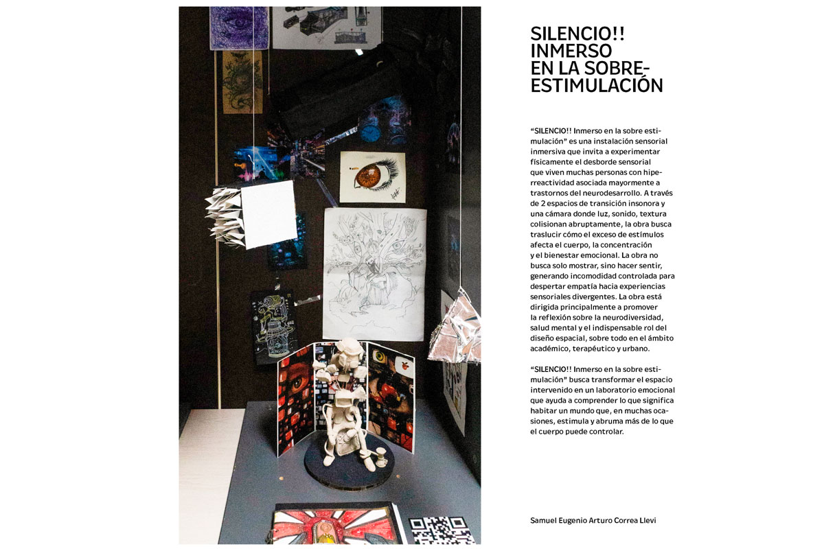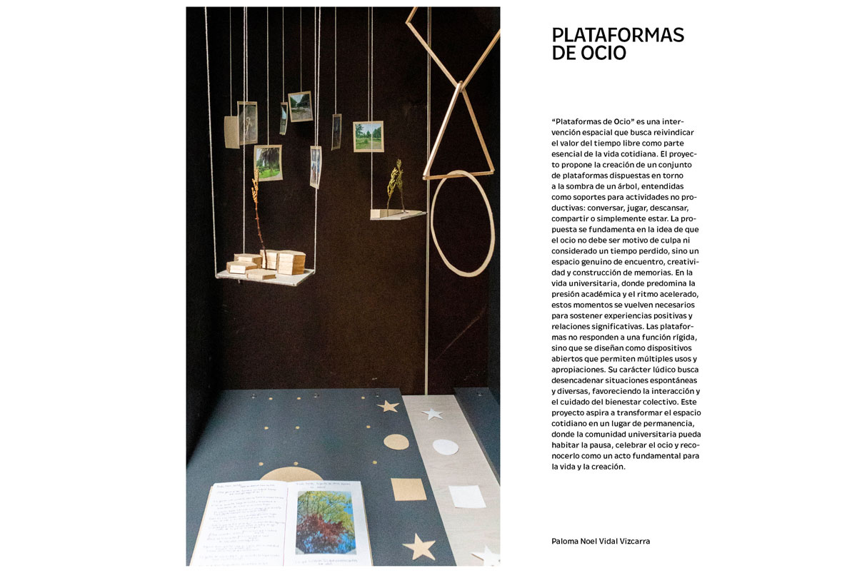 La muestra propuso una exploración experimental en el cruce entre arte y arquitectura. A través de bitácoras, dibujos, escritos y pequeños montajes, se evidenció un trabajo enfocado en la búsqueda personal, la reflexión crítica y la experimentación, situando el énfasis en el proceso creativo más que en la obra finalizada.